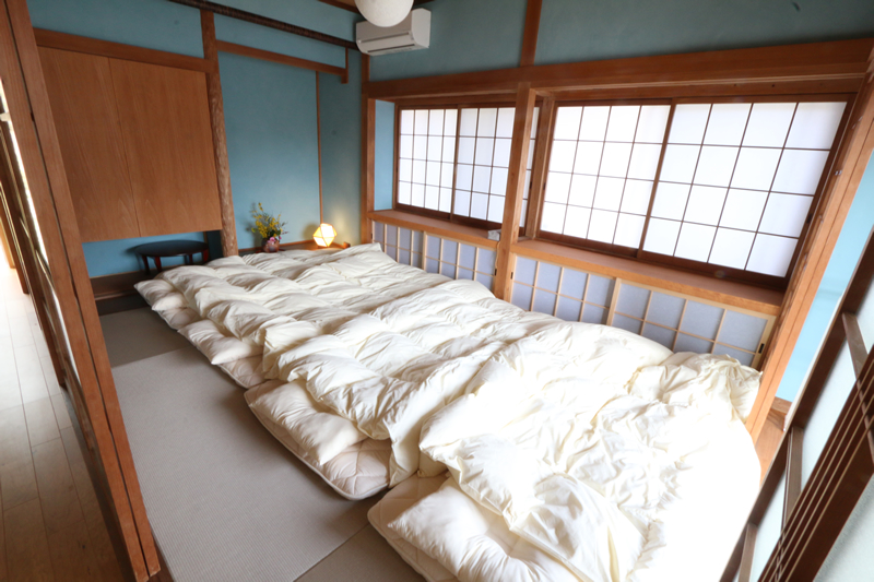 We have prepared a small round low table and cushions for you, you can see Mt. Ishizuchi. Up to four people can sleep on the futons.
